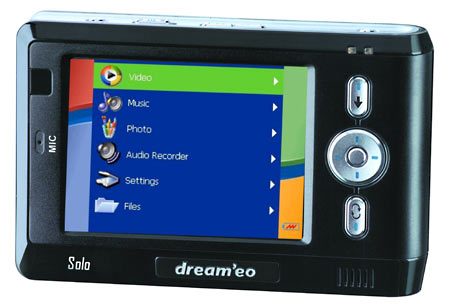Dream’eo. Cet appareil, de la famille des lecteurs multimédias portables, mesure 12,6 x 8,1 x 2,4 cm et pèse 260 g. Il intègre un disque dur de 20 Go et un écran