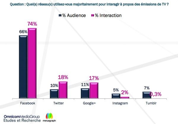 Cela dit, selon une autre étude publiée cette semaine par Omnicom Media Group, en France, c’est Facebook qui est le réseau social le plus utilisé pour interagir (74 %) devant Twitter (18 %) ou encore Google+ (17 %). Facebook est utilisé comme un flux d’actualité et un espace de discussion, tandis que Twitter apparaît plus comme un moyen de réaction et d’échange en temps réel. Mais les utilisateurs du site de microblogging sont plus réguliers dans leur pratique de la social TV.
