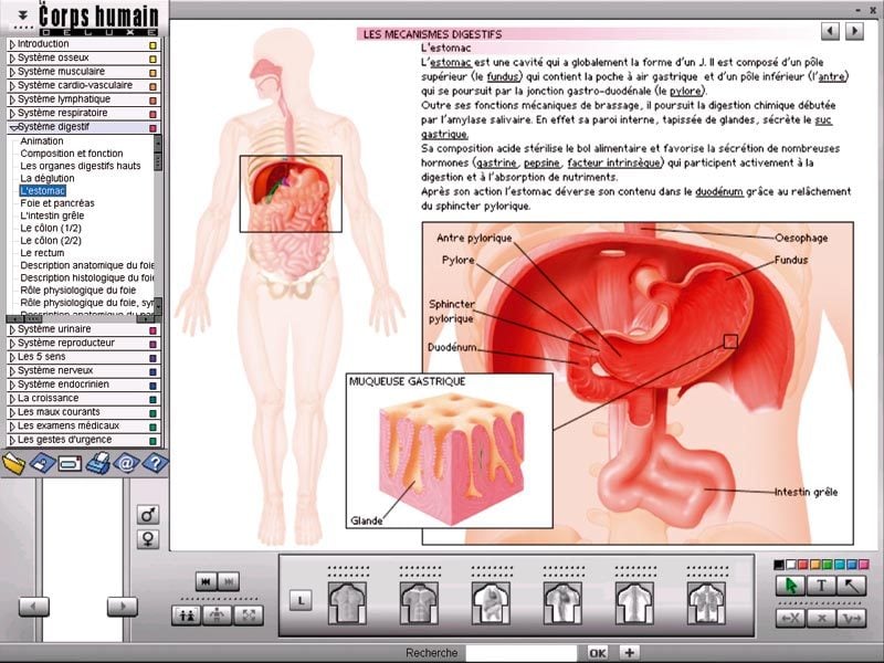 Le corps est ici aussi épluché, pour décortiquer la peau, les différents systèmes, l’ossature. Ce CD-Rom propose une approche certes très scolaire, mais qui a le mérite d’une grande clarté, notamment en ce qui concerne les
