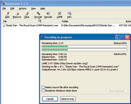 célèbre des encodeurs MP3 gratuits, Lame. Celui-ci devra être téléchargé séparément, et il faudra préciser dans les options de RazorLame dans quel dossier il se trouve. L’interface est plutôt confuse, mais le peu de fonctions proposées permet de s’y