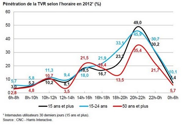 En 2012, 41,9 % des utilisateurs ont regardé des programmes en TVR au moins une fois par semaine, contre 37,5 % en 2011. La part des utilisateurs quotidiens demeure faible mais elle progresse (+1,9 point à 7,9 % en 2012). Si selon l’âge, les heures d’utilisation de la TVR varient, globalement les heures de grande écoute se situent entre 18 heures et minuit. 49,0 % du public déclare en effet avoir regardé des programmes en TVR entre 20 heures et 22 heures, 30,2 % entre 22 heures et minuit et 23,2 % entre 18 et 20 heures.
