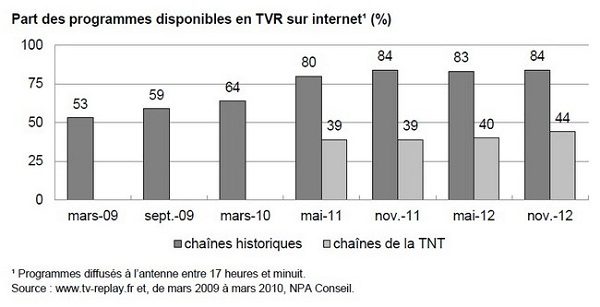Si les Français profitent plus de la TVR, c’est aussi parce que l’offre continue de se développer et que les chaînes enrichissent régulièrement leurs catalogues de programmes. Le CNC compte ainsi que 13 200 heures de programmes ont été mises à disposition du public en TVR par mois par des chaînes nationales gratuites (+25,3 % par rapport à 2011). Les programmes de stock composent 12 % de l’offre de TVR dont 6,1 % pour la fiction (majoritairement française 41,7 %), 3,2 % pour le documentaire, 2,6 % pour l’animation et 0,2 % pour les films.