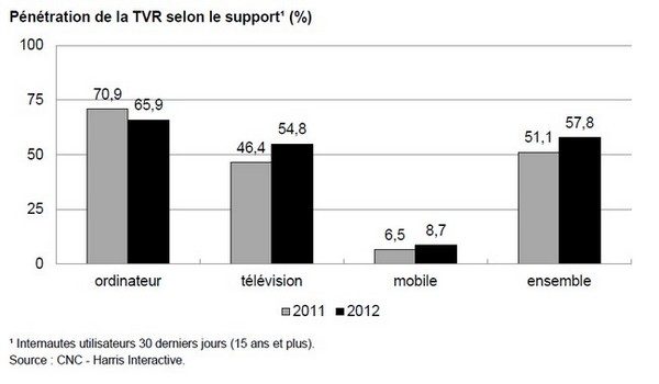 Le CNC note enfin que si l’ordinateur demeure le premier support de consommation de la télévision en ligne (qui inclut la TVR ainsi que les bonus et la consommation des chaînes en direct sur les autres supports que la télévision), la part de ce support dans la consommation totale est en baisse (58,3 % en 2012, contre 71 % en 2011) en raison de la très forte progression de la consommation sur les autres écrans. En 2012, l’écran de télévision génère 28,5 % de la consommation totale, contre 23,3 % en 2011. Même si l’accès à la télévision par le réseau hertzien reste prioritaire (59,6 %), de plus en plus de Français disposent de téléviseurs connectés et peuvent donc profiter de l’offre de TVR disponible sur les portails des constructeurs.