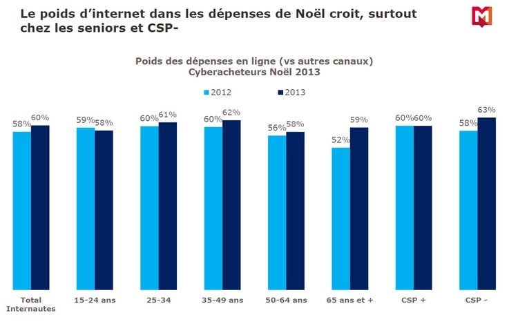 Comme pour l’e-commerce en général, on voit une augmentation des achats en ligne des seniors (à partir de 65 ans). Ce sont eux qui prévoient de dépenser le plus sur Internet (241 euros) devant les 35-49 ans (219 euros). Et c’est parmi les catégories socio-professionnelles (CSP) supérieures que l’on fera le plus d’achats en ligne même si le poids des dépenses sur Internet augmente parmi les CSP- passant de 58 % en 2012 à 63 % cette année.