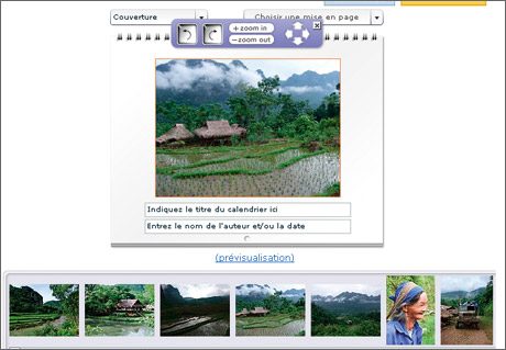 Kodak propose la composition automatique ou la personnalisation page par page. L’outil de mise en page est vraiment simple et agréable à utiliser. Il faut au préalable choisir un fond parmi les onze proposés. Dommage, au passage que