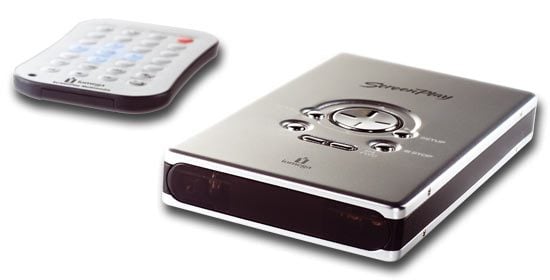 télévision, d’un ordinateur ou de haut-parleurs, grâce à des sorties audio et vidéo RCA (composite).Le Screenplay est compatible avec les fichiers MP3, WMA, DivX, AVI et MPEG-4. Connecté à un ordinateur, il est auto-alimenté par la connexion USB. Le disque dur est fourni avec une télécommande.Enfin, le