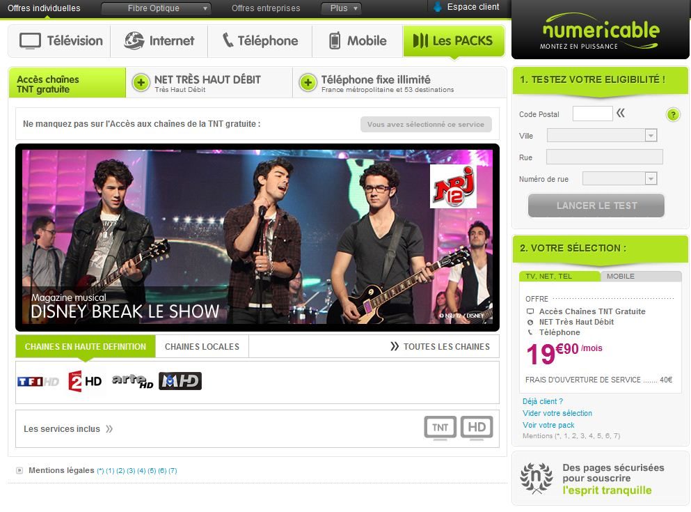 Au vu des services proposés, le terme de dual play semble plus approprié. Si l’accès à Internet (30 ou 100 Mbit/s selon les zones) et la téléphonie (illimitée vers les fixes en France et 53 destinations à l’international) sont au rendez-vous, la télévision fait de la simple figuration. Seules les 18 chaînes de la TNT, par ailleurs diffusées gratuitement par voie hertzienne, sont intégrées à l’offre. L’abonné doit, en plus, être en possession d’un décodeur TNT, Numericable n’en fournissant pas.