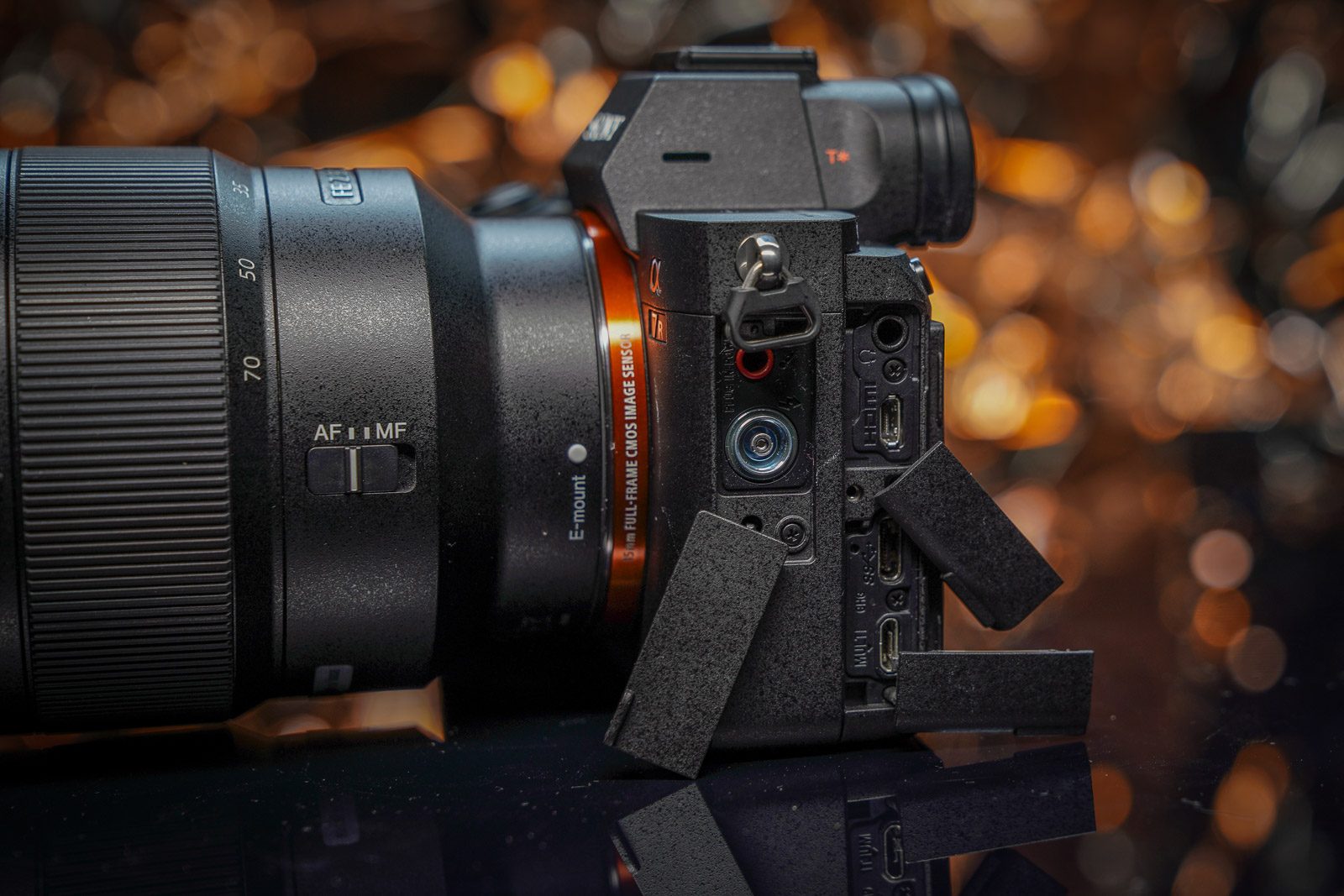 L’appareil conserve le Micro USB 2.0 Multi, la prise microphone, la prise casque et la prise Micro HDMI mais reçoit en plus une prise synchro flash et une prise USB supplémentaire au format USB C à la norme USB 3 Gen 1 (5 Gbit/s). Cette prise devrait largement accélérer la prise de vue en mode connecté ainsi que le vidage des cartes mémoires, la seconde prise pouvant recharger en même temps l’appareil (pratique pour les long timelapses !). Les photographes de studio eux, se réjouissent de l’arrivée de la prise synchro flash, un geste logique puisque Sony a entamé un partenariat avec le spécialiste de la l’éclairage de studio, Profoto.