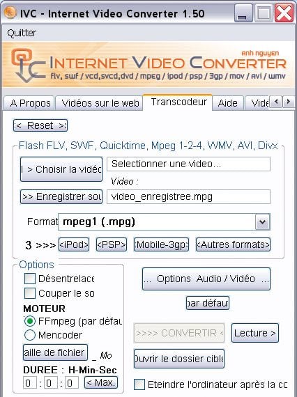 Si vous souhaitez lire la vidéo sur d’autres supports (baladeur vidéo, téléphone portable, PDA, téléviseur…), vous devez la convertir. Téléchargez le logiciel Internet Video Converter (IVC) à l’adresse