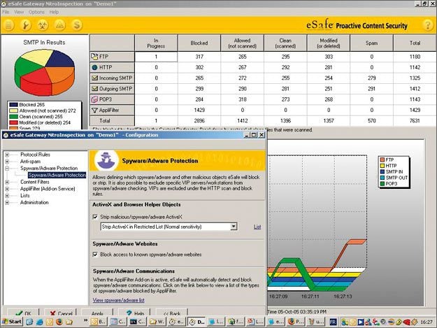 l’accès aux sites hébergeant des spywares à partir de listes noires.Si un poste est infecté, eSafe neutralise les communications entre l’espion et son serveur hôte. Mais il ne dispose pas encore de fonction curative.
