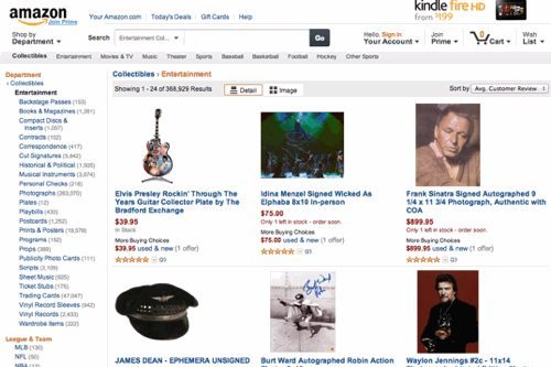 D’innombrables pochettes d’albums, programmes de concert, affiches et autres photos sont vendues pour des sommes beaucoup plus modiques. « Il y a quelque chose pour tout le monde », a expliqué le vice-président d’Amazon Marketplace, Peter Faricy. « Les fans trouveront des souvenirs de leurs artistes, acteurs et icônes du monde du spectacle préférés, et les aficionados découvrirons des objets très rares pour leurs collections ». Le nouveau magasin virtuel d’Amazon.com servira de plate-forme à plusieurs distributeurs spécialisés dans ce genre de souvenirs, comme Premiere Props.