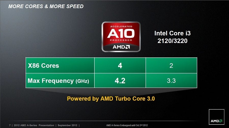 Toutefois, AMD ne vient pas se confronter aux Core i7 d’Intel. Les processeurs Trinity A4, A6, A8 et A10 viennent se placer en face des Pentium G, Core i3, voire les toutes premières références de Core i5. Sur le papier, ils proposeraient plus de puissance et de performances que les puces concurrentes et ce, pour un prix égal ou inférieur. On note toutefois que dans ses documents, le fondeur compare son modèle haut de gamme, l’A10, à un « petit Core i3 » de son rival.