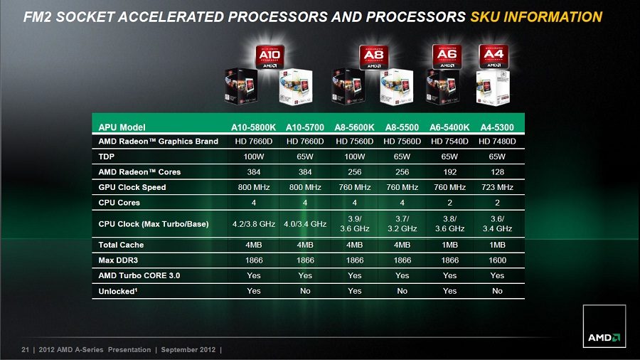 Toutes ces puces sont compatibles avec de nombreuses technologies AMD comme le TurboCore 3.0 qui, à l’instar du Turbo Boost d’Intel, permet d’augmenter dynamiquement la fréquence des cœurs au travail ou encore l’EyeFinity, cette solution triple écran qui permet de jouer ou de travailler dans des définitions XXL. Les processeurs dont les références se terminent par un « K » peuvent subir des augmentations de fréquences aussi bien sur les cœurs de calcul que sur la puce graphique intégrée.