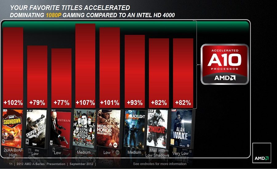 Selon AMD, il est possible de jouer à bon nombre de jeux récents dans des niveaux de détails modérés sur un écran HD (ou Full HD grâce à Dual Graphics). A cette fin, toutes les cartes mères en FM2 devraient proposer un panel complet de sorties vidéo (HDMI, DisplayPort, DVI et VGA) en plus des prises USB 3.0, des connecteurs Sata II et III, etc.