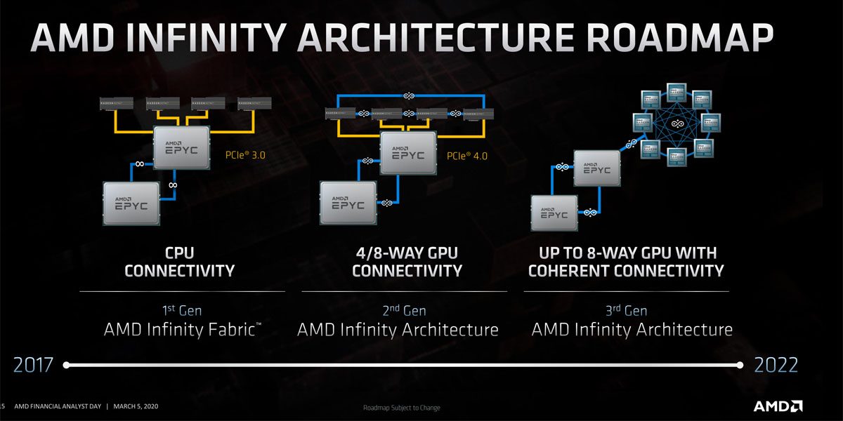 À l’heure actuelle, deux CPU EPYC peuvent être « couplés » par le protocole d’interconnexion Infinity Fabric et ainsi adresser jusqu’à quatre GPU chacun. Problème : chaque GPU est perçu comme une entité unique, sans partage d’information entre eux. La prochaine et deuxième génération du protocole prend le nom de « Infinity Architecture », et permettra à chaque CPU d’adresser chacun quatre GPU qui non seulement pourront communiquer avec le CPU, mais aussi échanger des données entre eux. De quoi éviter au système de perdre trop de temps à faire circuler les informations d’un GPU à l’autre.