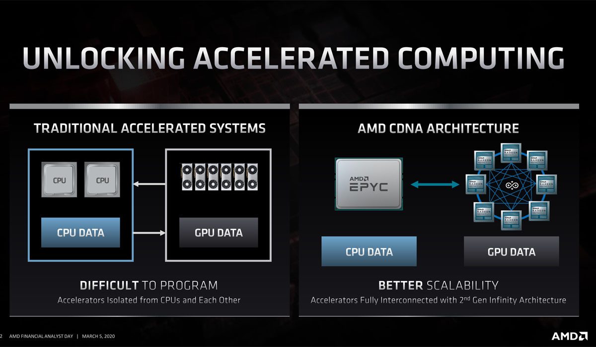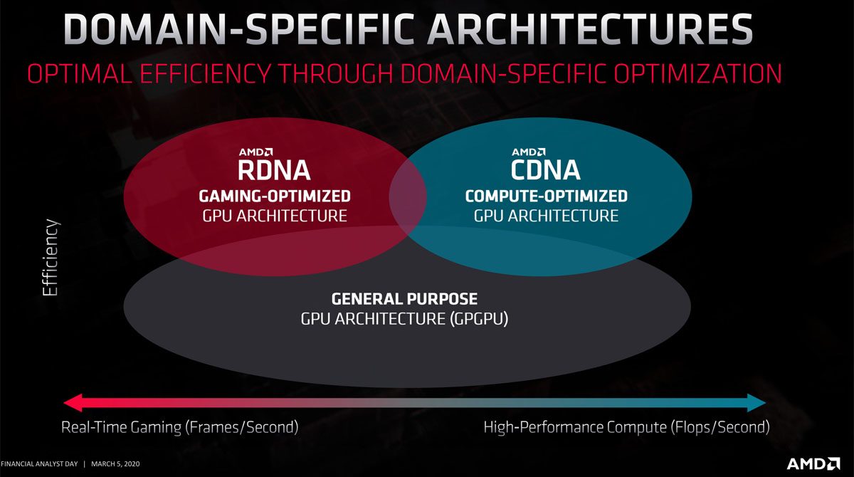 L’autre innovation d’AMD est la création d’une nouvelle ligne de GPU professionnels basés sur une architecture appelée CDNA. Au contraire de ses puces RDNA (Radeon DNA) dont l’usage premier est graphique, qu’il s’agisse de cartes de jeux ou de cartes de rendu 3D professionnelles, les puces CDNA font l’impasse sur tout ce qui touche à l’affichage et sont optimisées pour le calcul.