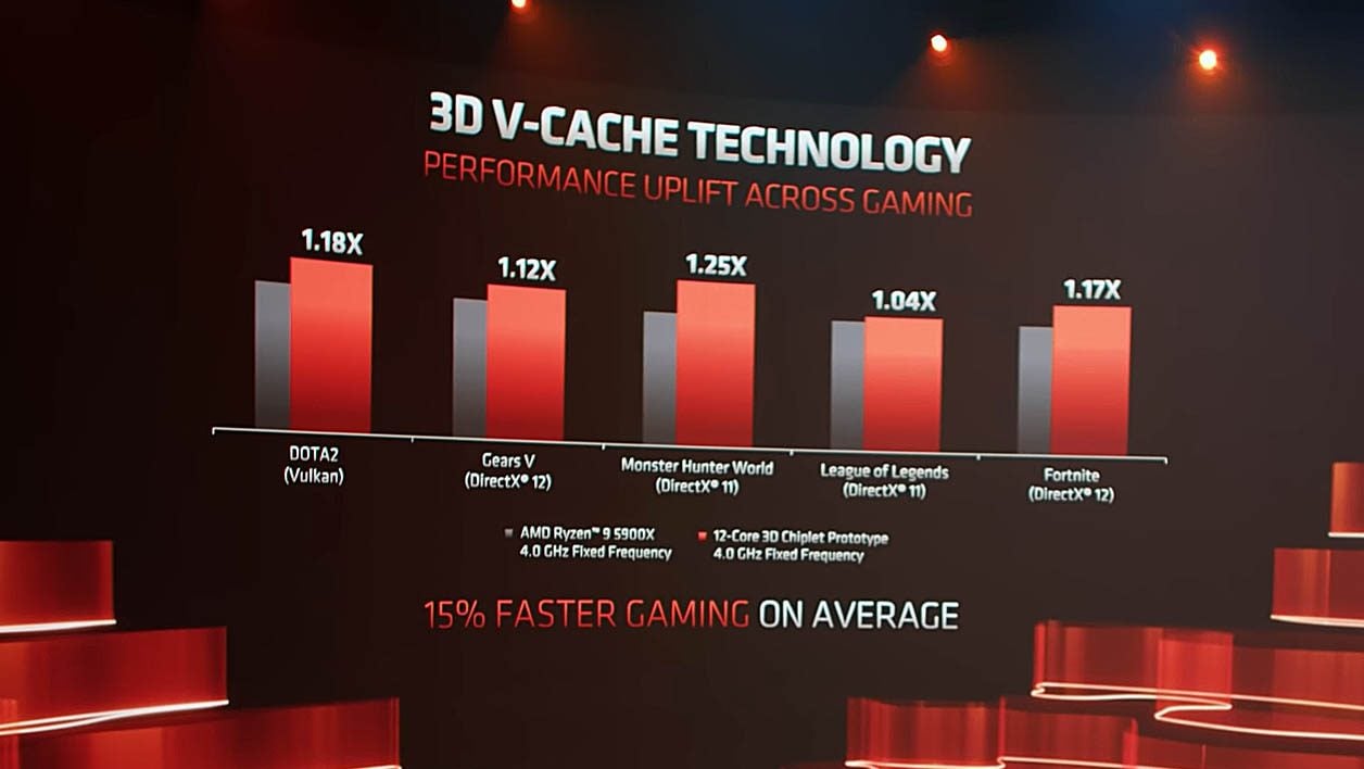 Pour présenter le résultat de cette greffe, AMD a comparé deux machines équipées de la même carte graphique. L’une propulsée par un Ryzen 9 5900X normal, l’autre avec le CPU certes expérimental, mais similaire aussi bien en technologie CPU (Zen 3), qu’en nombre de cœurs et fréquence max (12/24 cœurs/tâches à 4,0GHz).