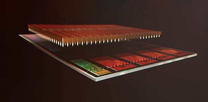 Parlons d’abord du principe employé. AMD est un grand spécialiste des puces assemblées à partir de blocs – des chiplets dans le jargon. C’est autour de cette approche moins monolithique que dans le passé, qu’AMD a développé ses puces Ryzen – avec le succès que l’on connaît. La technique employée ici va plus loin que la simple apposition de blocs côte à côte en les interconnectant via un support (une technologie appelée Infinity Fabric, au cœur de toutes les puces actuelles).