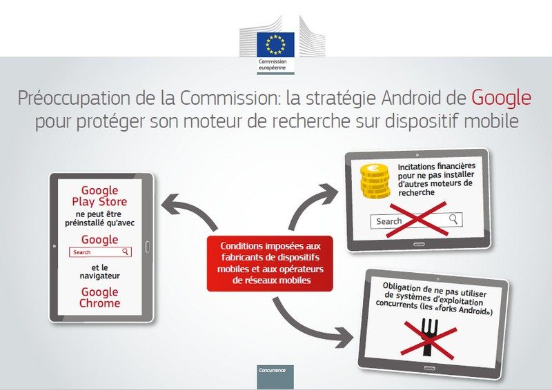 La Commission a communiqué ses griefs à Google concernant le système d’exploitation et les applications Android, après une enquête ouverte en avril 2015. Elle affirme que Google a enfreint les règles de la concurrence de l’Union européenne en :