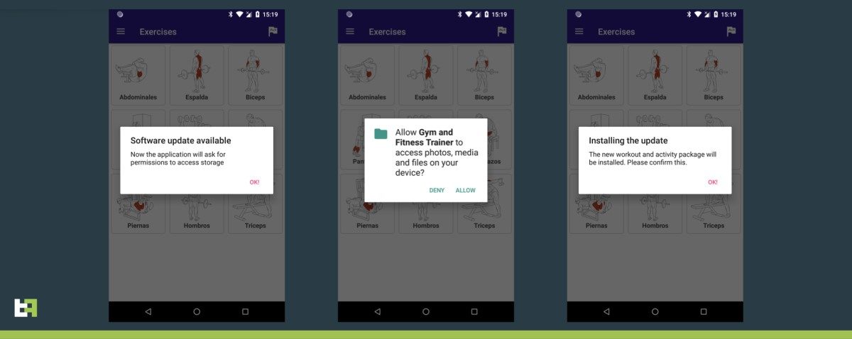 Un autre exemple est Gym and Fitness Trainer, qui propose des guides d’exercices de fitness. L’utilisateur est incité à télécharger une nouvelle série d’exercices. En réalité, il se retrouve avec un malware. Aucun message louche n’est affiché cette fois-ci, tout se passe comme une véritable mise à jour de l’application. Cette mise à jour provient du site « officiel » de l’application, que Google a pu inspecter par le passé. Mais à l’époque, il n’y avait aucune mise à jour malveillante à signaler.