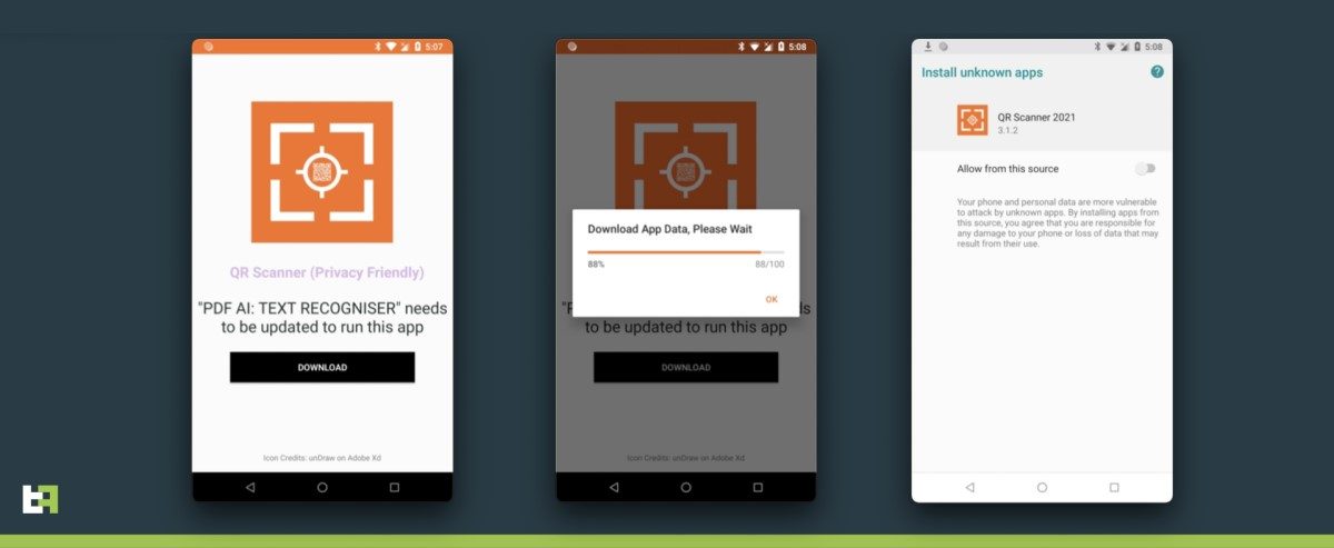L’application QR Scanner 2021 va, par exemple, notifier l’utilisateur qu’une mise à jour est nécessaire pour continuer à utiliser le service. En réalité, il télécharge un malware. Android va l’alerter qu’il est en train d’installer « une application inconnue », mais ce message n’est pas forcément suffisant pour stopper le processus.