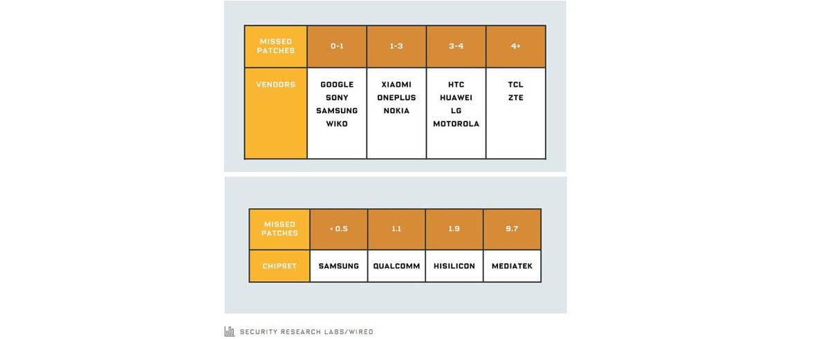 La marque ne fait pas tout : si Google (logique !), Sony, Samsung et Wiko (oui, oui) sont de bons élèves si on s’en réfère au graphique de classement publié par Wired grâce aux informations du SRL, les chercheurs relèvent des disparités au sein des gammes… et des plateformes techniques. Ainsi, les chercheurs relèvent que les appareils à base de processeurs Samsung sont plus souvent mis à jour que deux qui intègrent des puces chinoises MediaTek qui ont, en moyenne, 10 patches de sécurité de retard ! La raison n’est pas uniquement technique mais aussi économique : les puces MediaTek font peut-être moins l’objet d’un suivi de la part de l’entreprise, mais c’est surtout que ces puces d’entrée de gamme équipent les appareils les plus cheaps… et donc les bien moins suivis dans le temps par les constructeurs.