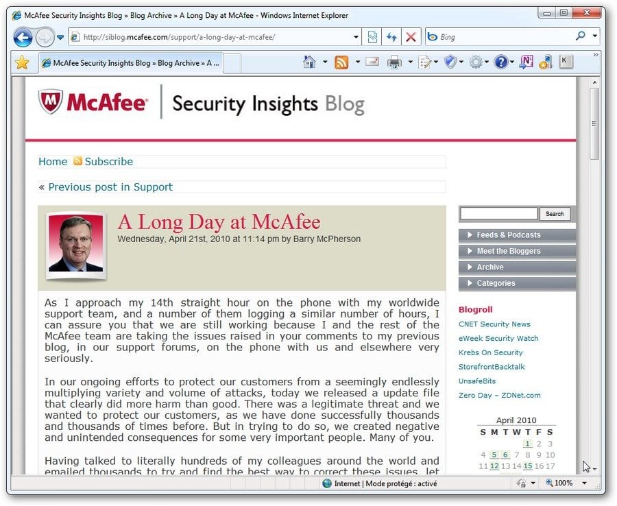 Sur son blog, le responsable du support, Barry McPherson, raconte sa dure journée passée à assister les utilisateurs. Il écrit ainsi : « Des erreurs peuvent toujours être commises. Nous n’avons aucune excuse. Les quelques 7 000 employés de McAfee sont tous, à l’heure actuelle, focalisés sur deux choses. D’abord aider nos clients affectés par ce problème à retrouver une activité normale. Ensuite, s’assurer que nous mettons en place les processus de sorte que cela ne se reproduise plus jamais ».