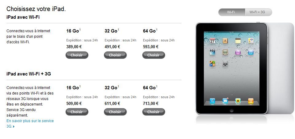 Auparavant vendue 813,35 euros, la tablette la plus haut de gamme, dotée d’une mémoire de 64 Go, du Wi-Fi et de la 3G, n’est plus qu’à 713 euros, soit 12 % de diminution. Le rabais est plus important sur le modèle de 64 Go doté du Wi-Fi seulement, puisqu’il passe de 713 à 593 euros (– 17 %). Quant au modèle d’entrée de gamme (Wi-Fi et 16 Go de mémoire), son prix est ramené de 508 à 389 euros (– 23 %). La version de 16 Go dotée, en plus, de la 3G, est désormais à 509 euros au lieu de 608 (– 16 %).