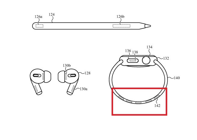 Pour la montre, Apple pourrait mettre des capteurs de pression sur le bouton, mais aussi dans le bracelet (le rectangle rouge dans l’image ci-dessus), ce qui permettrait par exemple de mesurer le pouls. Les capteurs pourraient également être intégrés dans des bracelets connectés, pour par exemple mesurer la pression artérielle et d’autres paramètres de santé. Le constructeur mentionne le concept de « moniteur de santé portable » pour des « patients ».