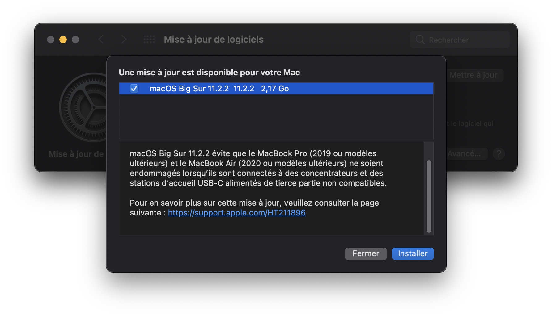 Apple vient de mettre en ligne la mise à jour 11.2.2 de macOS Big Sur pour le grand public. L’arrivée de cette mise à jour surprise a une bonne raison d’être puisqu’elle vient corriger un problème sur les MacBook Pro (modèles 2019 et ultérieurs) et MacBook Air (modèles 2020 et ultérieurs) qui peuvent être endommagés après la connexion d’un dock ou d’une station d’accueil USB-C alimentés non conformes.