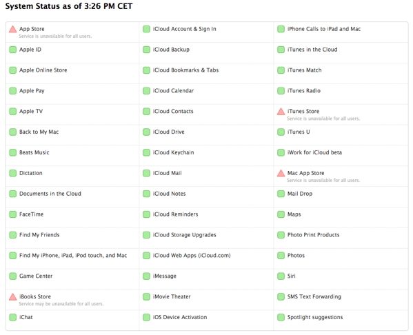 15h33 Les services d’Apple sont toujours partiellement en panne. Le géant américain semble a pris conscience du problème à en croire la page de statuts de ses services. L’App Store, l’iTunes Store, l’iBooks Store et le Mac App Store sont indiqués comme « inaccessibles pour tous les utilisateurs ».