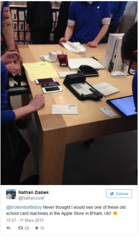 16h31 Un Tweetos américain constate que la panne de système informatique semble toucher de nombreux services chez Apple. Même les paiements électroniques paraissent en panne dans les Apple Store. Les blue guys en sont réduits à devoir ressortir les vieux sabots pour prendre les empreintes de cartes de paiement. On est assez loin du paiement sans contact de l’Apple Pay…