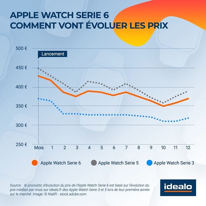 Nous avons demandé au comparateur de prix Idealo d’établir un graphique prédictif de l’évolution du prix de la nouvelle montre connectée d’Apple, dans sa version de base. Ce graphique montre également comment a évolué le prix de la Watch Series 5 et de la Watch Series 3 lors de leurs premières années de commercialisation.