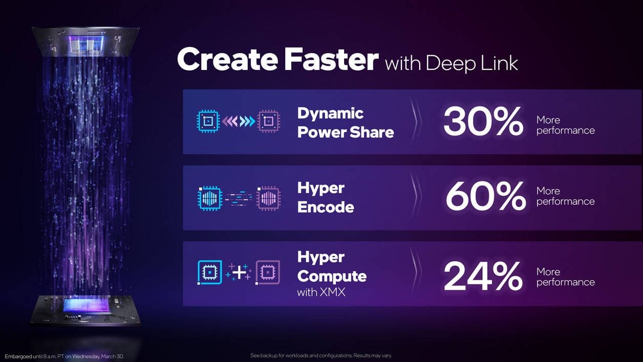 Grâce à Dynamic Power Share, Deep Link gère les fréquences (et donc la consommation du tout) selon le type de charge. Hyper Encode lui, découpe les tâches d’encodage vidéo pour profiter à la fois des capacités de la puce Arc mais aussi du iGPU intégré aux processeurs Intel.