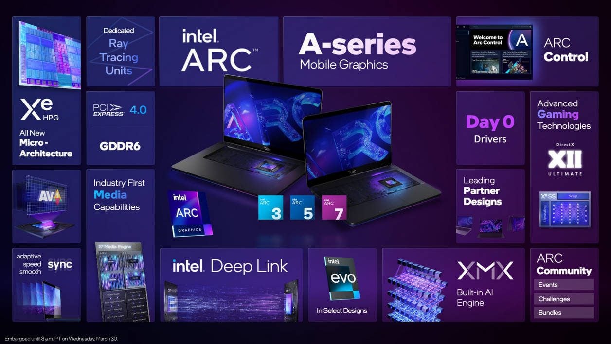 Les premières puces graphiques Arc d’Intel arrivent enfin ! Cette première fournée de la génération Alchemist est dédiée aux PC portables, avant que n’arrivent, au début de l’été, les premières cartes graphiques PCI express pour les PC au format tour.