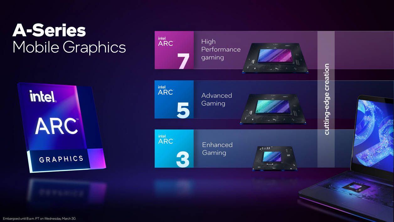 Trois gammes de puces composent cette série mobile dite « A » : les Arc 3, Arc 5 et Arc 7, dans l’ordre croissant des performances. Trois gammes, mais seulement deux puces différentes : ACM-G11 et ses 8 cœurs maximum pour Arc 3 ; et ACM-G10 et ses 32 cœurs maximum pour Arc 5 et Arc 7.