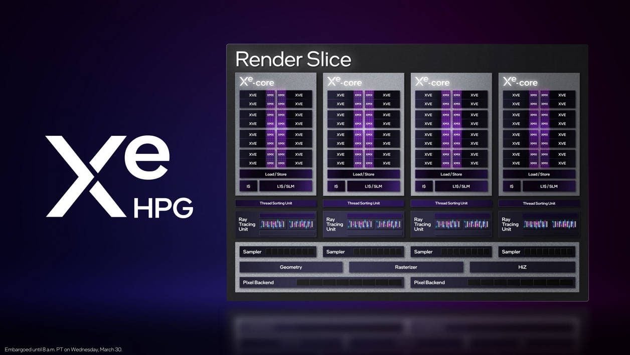 Cette architecture est capable de paralléliser jusqu’à huit de ces tranches, soit 32 cœurs au maximum. Dans chaque « tranche », chaque cœur de rendu est constitué de 16 moteurs de rendu vectoriel 256 bit (XVE), et 16 moteurs de rendu matriciel (calculs liés à l’IA, notés XMX) en 1024 bit. L’ensemble se partageant 192 Ko de mémoire cache.