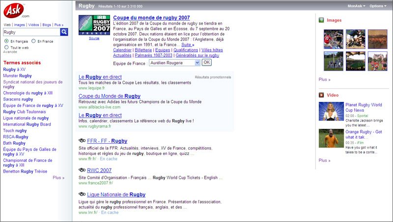 depuis le mois de juin dernier.La fenêtre centrale, la plus large, liste les résultats textuels, avec quelques liens publicitaires en tête. A gauche, le champ de saisie reste accessible et en-dessous, Ask propose une série de ‘ termes