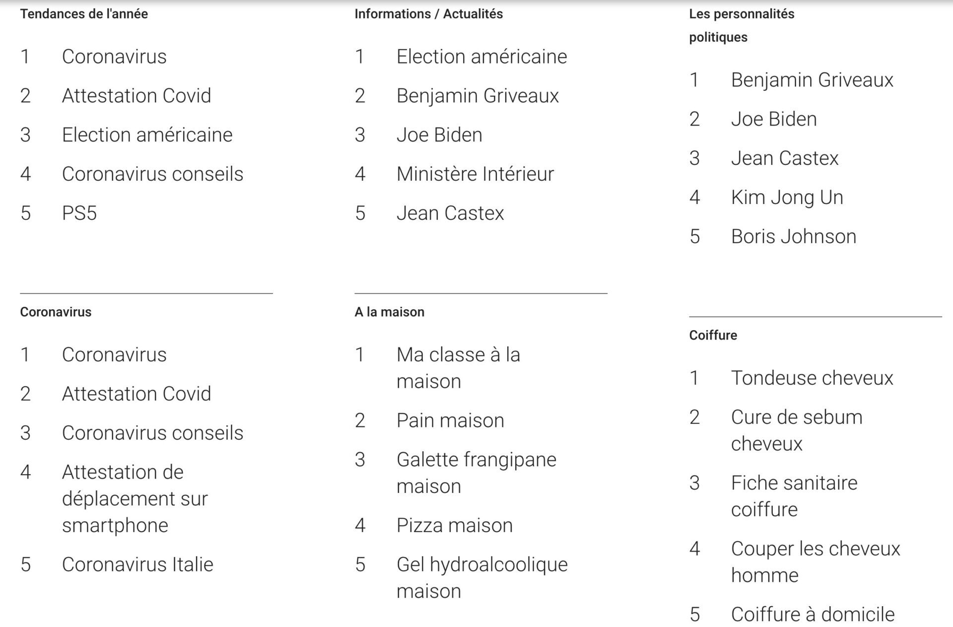 Et elles sont révélatrices. On trouve la catégorie des « personnalités politiques » dont le numéro un est… Benjamin Griveaux et le deuxième Joe Biden, les incontournables « comment » faire un masque (1), savoir qu’on a le coronavirus (2) ou encore mettre son masque (3) mais aussi les cinq principales tendances « coiffure », où l’on trouve « tondeuse » en premier, puis suit « cure de sébum » et enfin termine, sans surprise, par « coiffure à domicile ».