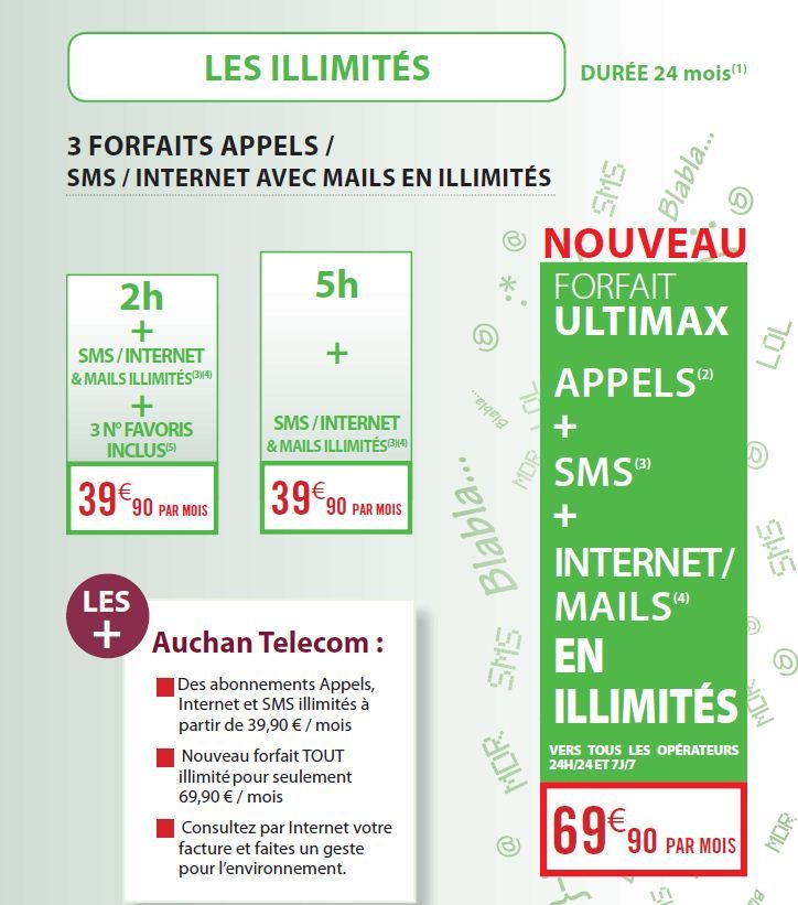 Depuis quatre ans, Auchan propose, par l’intermédiaire de sa filiale Auchan Telecom, des services mobiles à petits prix. Son catalogue vient de s’enrichir d’une offre « tout-illimité » qui garde bien l’esprit de la marque : le forfait Ultimax comprend les appels nationaux 7j / 7 et 24h / 24, les SMS et l’Internet pour 69,99 euros par mois, sous condition d’un engagement de 24 mois. Soit presque 30 euros de moins que les offres similaires d’Orange, avec son Origami Jet, et de SFR, avec son Illimythics absolu, tout deux en édition limitée.