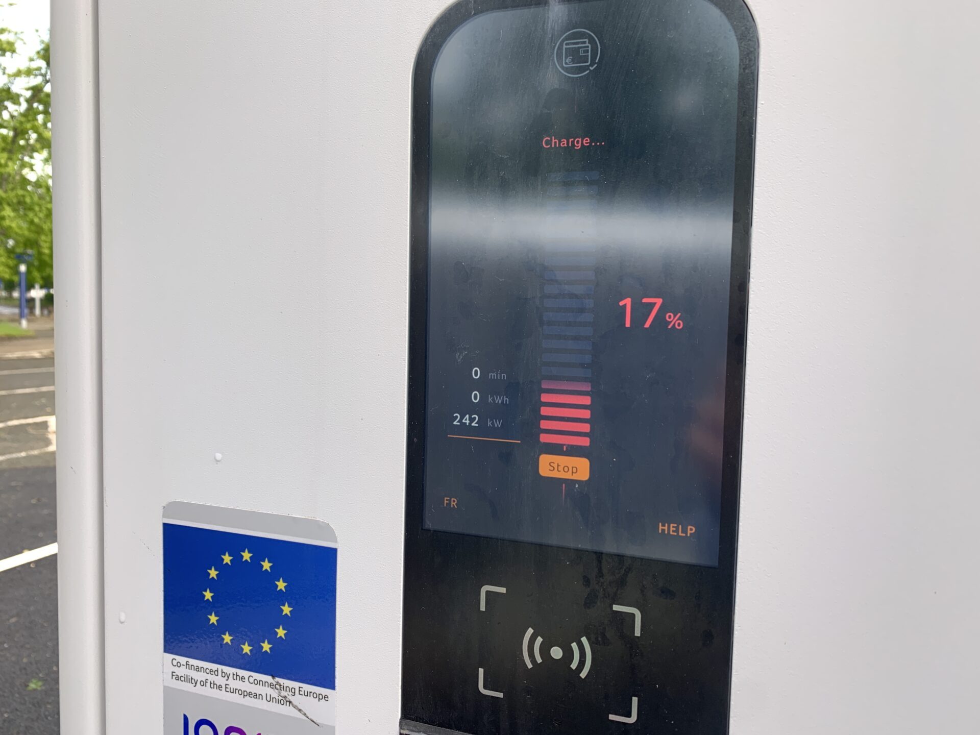 C’est à ce moment précis que notre regard est attiré par un panneau de signalisation plus que bienvenu : la prochaine aire disposerait d’une de bornes de recharge.