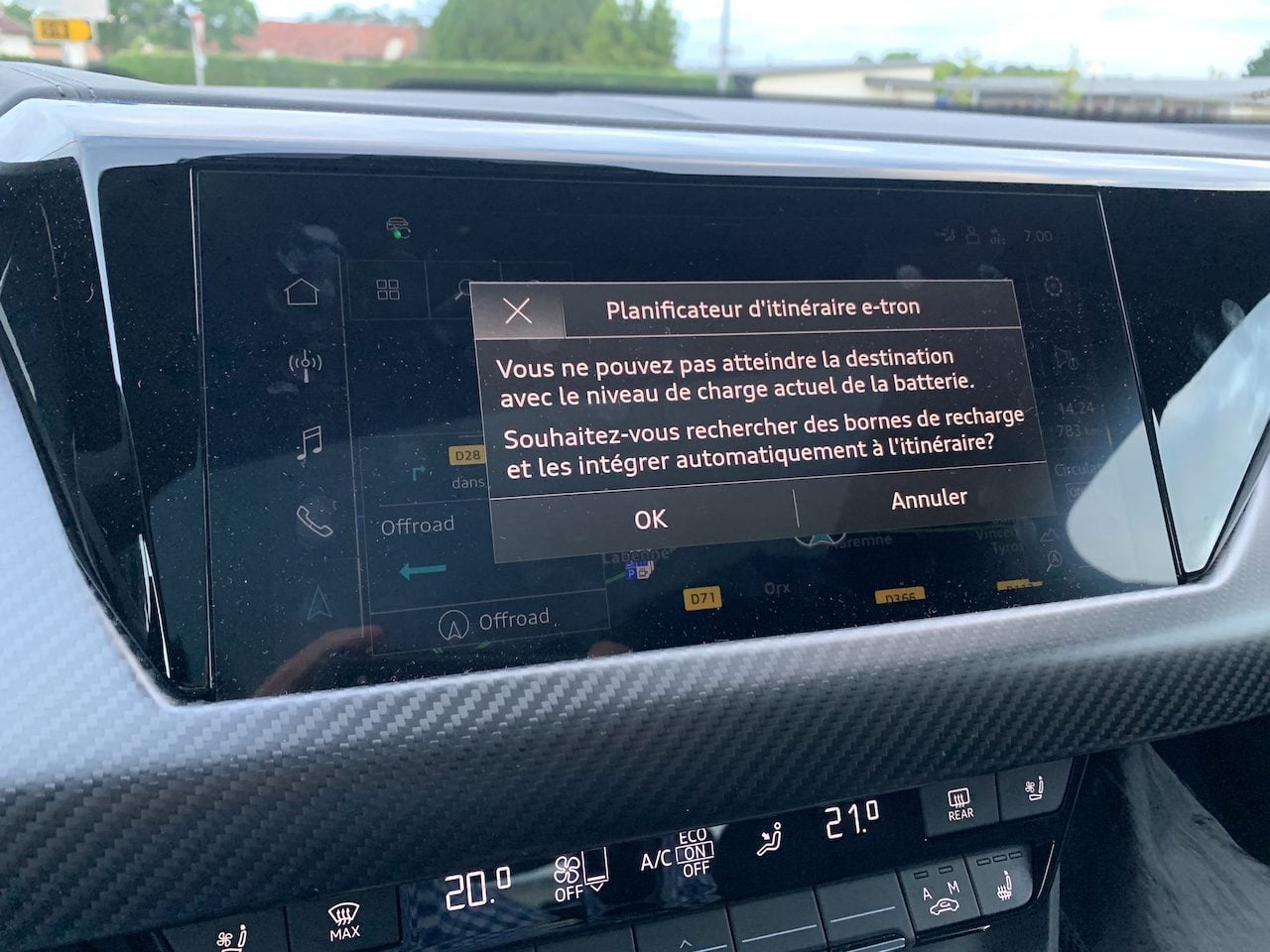 Comment expliquer cet impair ? Le système d’Audi est certes bourré de qualités, mais la finesse d’analyse ne fait pas partie de ses atouts. En effet, lors d’une recherche, lorsqu’il propose un itinéraire, il oublie d’évaluer ses alternatives et ce malgré notre surconsommation évidente. Dans la mesure où il nous juge capables d’arriver avant la panne, les options secondaires lui sont superflues. C’est doublement regrettable. D’une part, parce que ce procédé réduit les choix du conducteur, et surtout, d’autre part, parce qu’il augmente ses craintes.