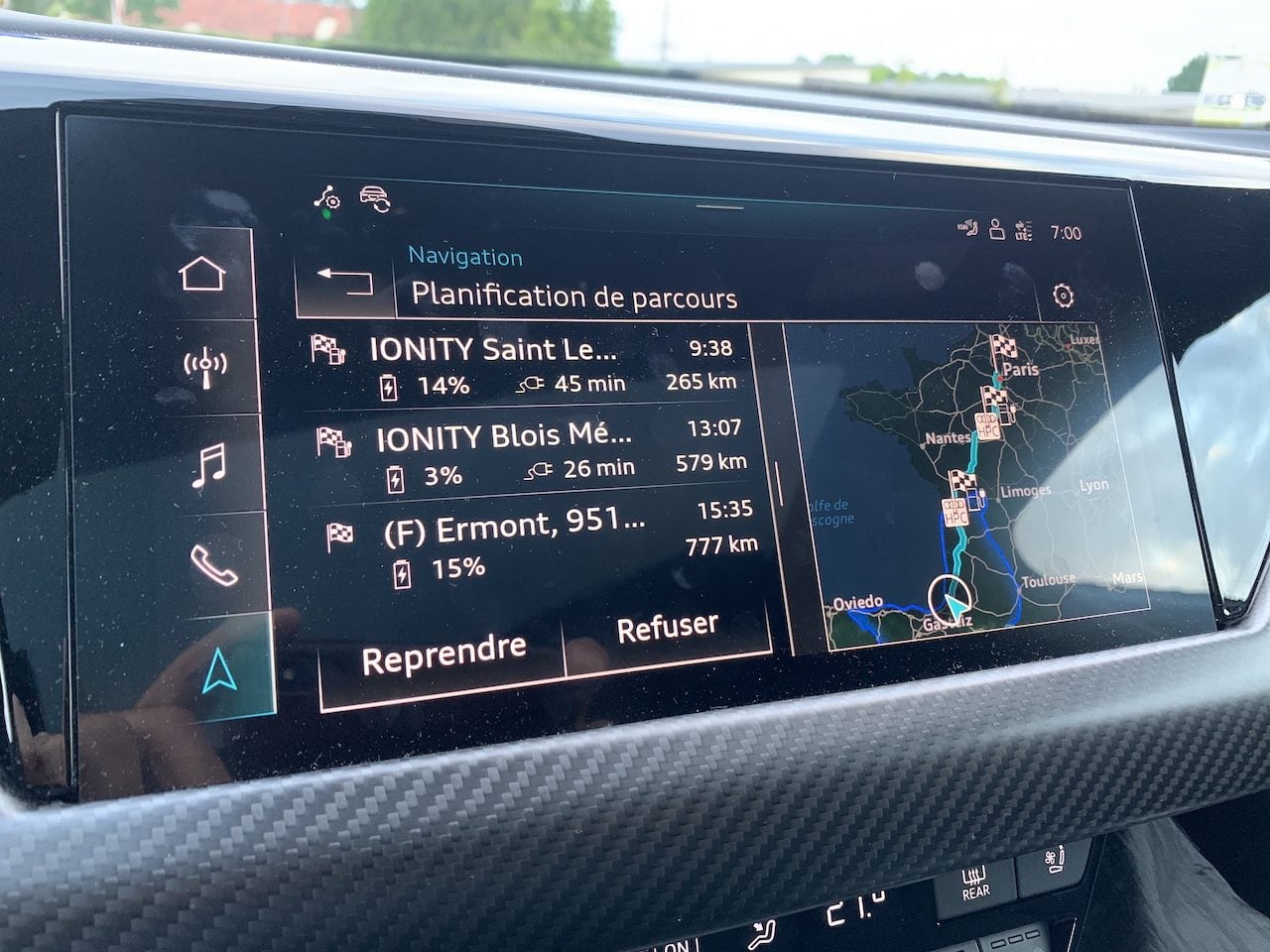 Malgré ces précautions, il apparaît assez rapidement qu’Audi MMI est quelque peu optimiste dans ses calculs. Notre matelas fond à mesure que nous roulons. À environ 150 km de notre étape poitevine, nous envisageons même un passage en mode de conduite « éco », voire de réduire notre vitesse moyenne pour éviter quelques sueurs froides.
