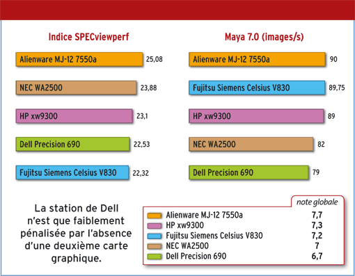 tests avec Maya donnent l’avantage aux machines munies d’Opteron sur la station Dell à base de Xeon.Lors de ce même test, l’absence de deuxième carte graphique pénalise légèrement la machine de NEC, également à base d’Opteron. Cette dernière est 14 % moins rapide que celle de HP, qui exploite deux cartes. Mieux, la