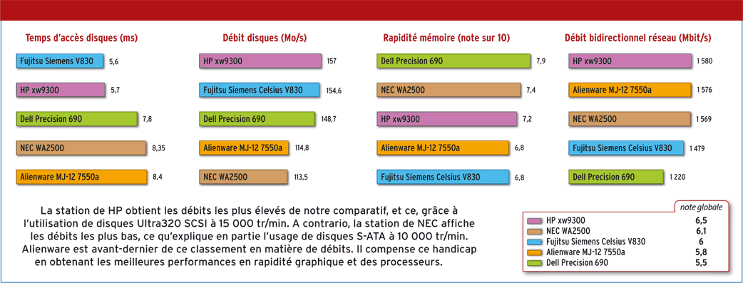 disques SAS (chez Dell), puis par les disques S-ATA (chez Alienware et NEC).La nouvelle architecture mémoire sur bus série des Xeon permet à la station Precision 690 de Dell d’arriver en tête pour le test de rapidité de la mémoire, suivie par la station WA2500 de NEC. Enfin, les débits observés lors des