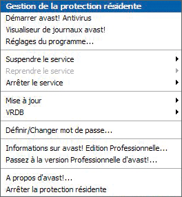 résidente (il assure la protection en temps réel du micro), qu’il faut régler avec attention.Cliquez du bouton droit de la souris sur l’icône d’Avast! en bas à droite de l’écran, et sélectionnez Gestion de la protection résidente :
