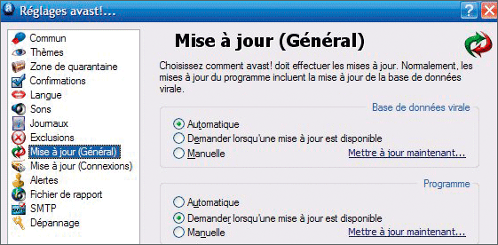 Dans le menu de gauche, sélectionnez Mise à jour (Général) et vérifiez qu’à droite les éléments sélectionnés sont bien Automatique pour Base de données virale et Demander lorsqu’une mise