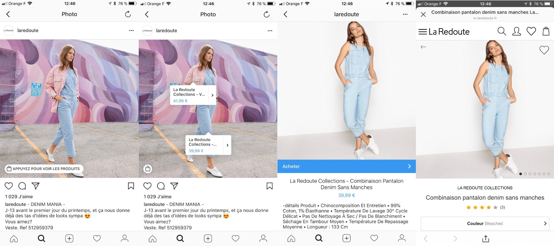 Sur leurs publications, les marques ont désormais la possibilité de tagger 5 produits. Par exemple, sur une photo d’un mannequin, un vendeur de vêtements peut tagger chapeau, t-shirt, pantalon, montre et chaussures, et rendre l’achat complètement interactif. Sur la page d’une marque, un onglet « Shopping » représenté par une étoile permet de retrouver toutes les publications contenant des liens vers une plate-forme d’achat.