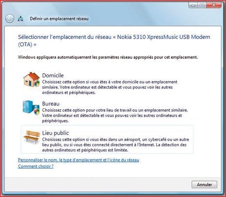 5 Sélectionnez, dans la fenêtre Définir, un emplacement du réseau, l’option Lieu public puis cliquez sur Fermer :