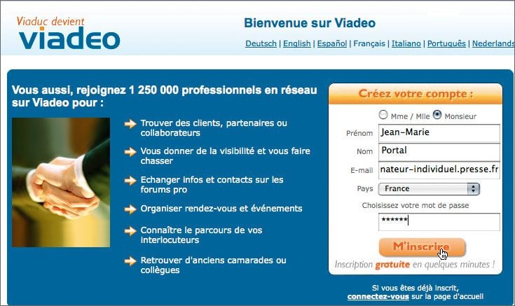 www.viadeo.com et cliquez sur le bouton M’inscrire. Remplissez le formulaire qui apparaît puis cliquez encore sur M’inscrire.